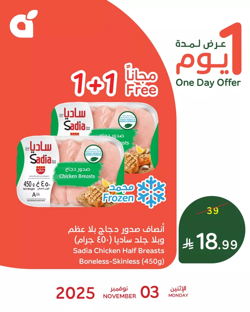 عروض بنده الاثنين 3 نوفمبر 2025 تقدم للمتسوقين فرصة مميزة للحصول على أنصاف صدور دجاج بلا عظم وبلا جلد من ماركة سادية المجمدة بوزن 450 جرام في عرض حصري متاح اليوم فقط 1+1 مجانا ابقوا علي تواصل معنا ليصلكم كل جديد عن عروض السعودية .