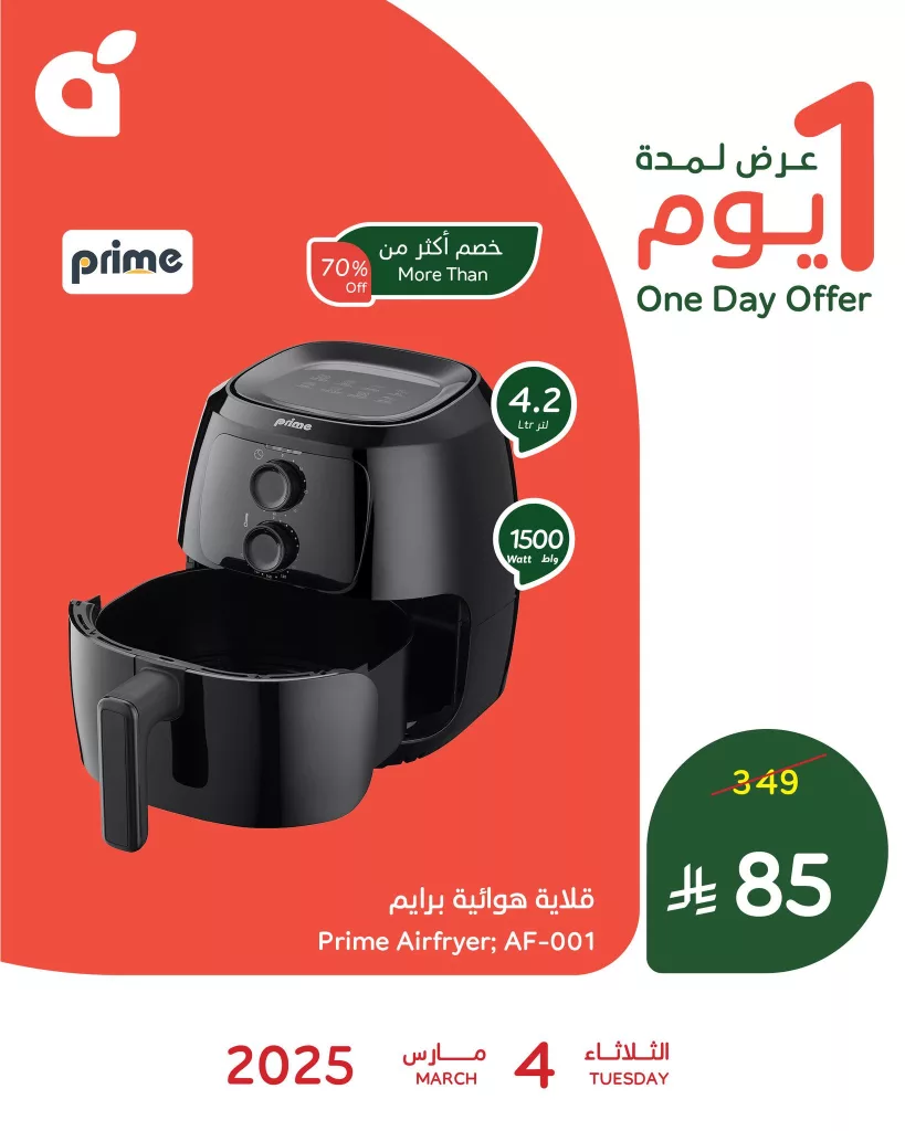 - قلاية هوائية برايم Prime Airfryer; AF-001 – 349 ريال (عرض خاص 85 ريال)