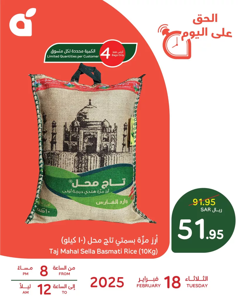• أرز مزة بسمتي تاج محل (10 كجم)51.95 ريال سعودي (بدلاً من 91.95 ريال سعودي)
