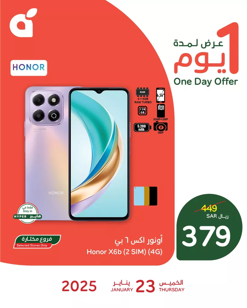 - هونر X6b (2 SIM) (4G) – السعر: 379 ريال سعودي (بدلاً من 449 ريال سعودي)
