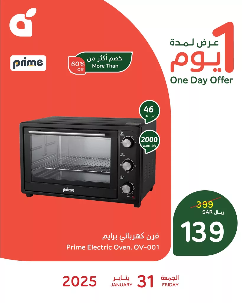عرض بنده الجمعة 31 يناير 2025 يقدم خصومات استثنائية على مجموعة متنوعة من المنتجات حيث يمكنك الاستفادة من تخفيضات مذهلة على الأجهزة الكهربائية التي تجعل تجهيز مطبخك أكثر سهولة وفعالية مع عروض اليوم الواحد و يمكنك الحصول على أفضل الأسعار على الأجهزة الأساسية مثل الأفران الكهربائية،