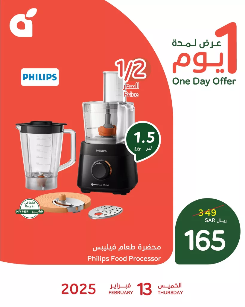 عروض بنده اليوم لا تقتصر على المنتجات الغذائية فقط بل تشمل أيضا الأجهزة المنزلية الضرورية مثل محضرة الطعام من فيليبس التي تأتي بسعة 1.5 لتر مما يجعل الطهي أسهل وأسرع و هذه فرصة رائعة للحصول على أجهزة كهربائية بجودة عالمية وبأسعار أقل فقط ليوم واحد