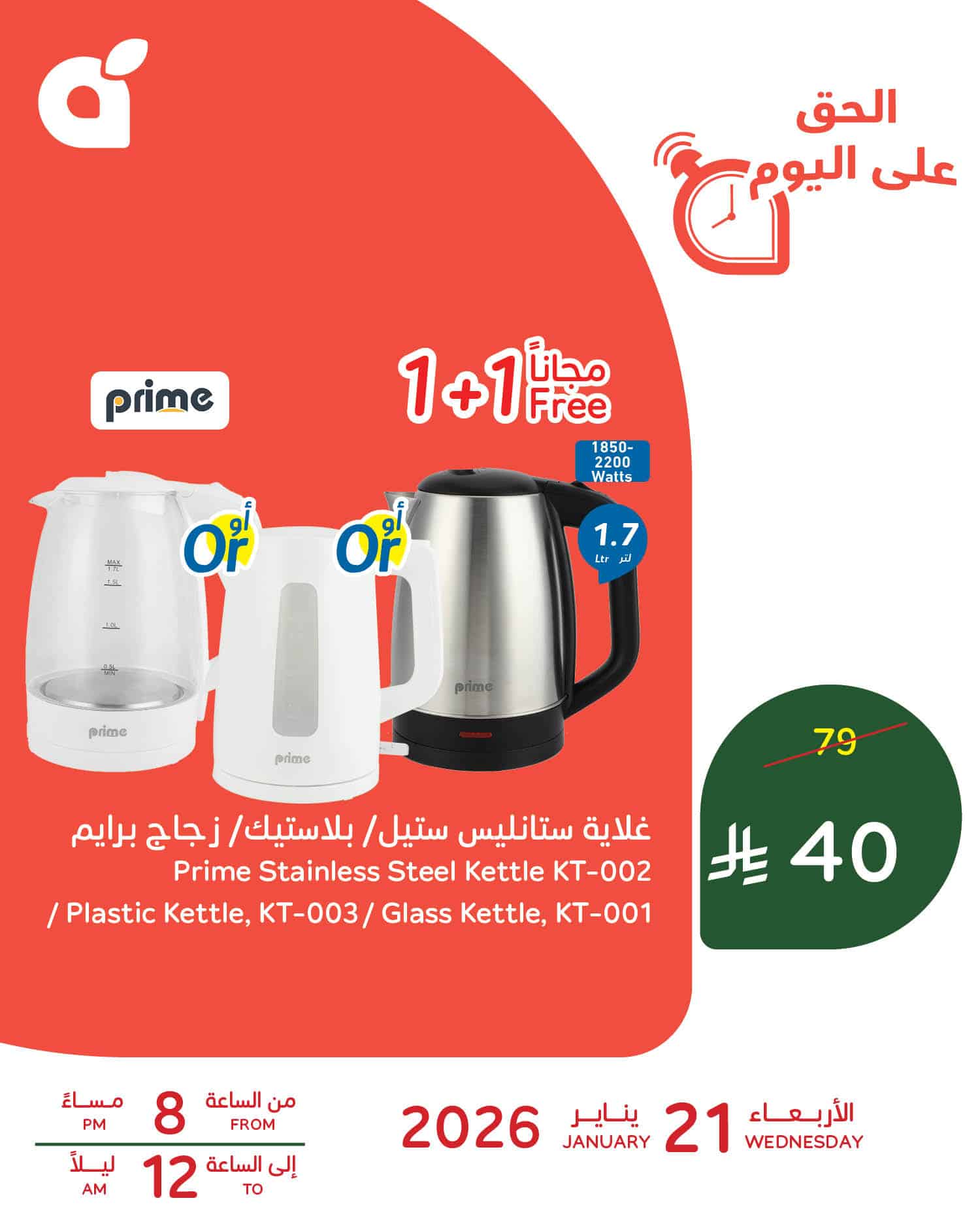 - سعر غلاية ستانليس ستيل / بلاستيك / زجاج برايم بـ 40 ريال سعودي (1+1 مجانا )