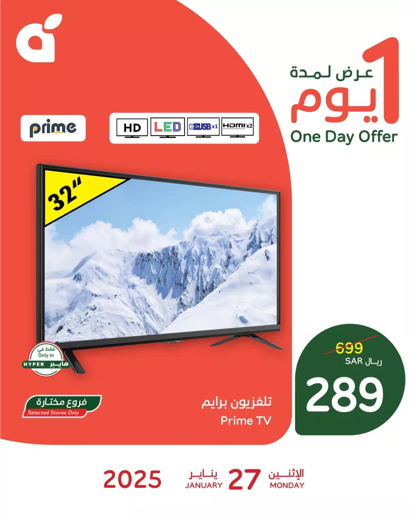 تعود بنده بعرضها المميز ليوم واحد فقط الاثنين 27-1-2025 حيث يمكنكم الاستفادة من تخفيضات حصرية على مجموعة متنوعة من المنتجات داخل فروع الهايبر المختارة و العرض يشمل تلفزيون برايم بحجم 32 بوصة والذي يأتي بجودة HD وتقنية LED بالإضافة إلى منافذ USB و HDMI ليمنحكم تجربة مشاهدة رائعة بسعر مخفض لا يقاوم.