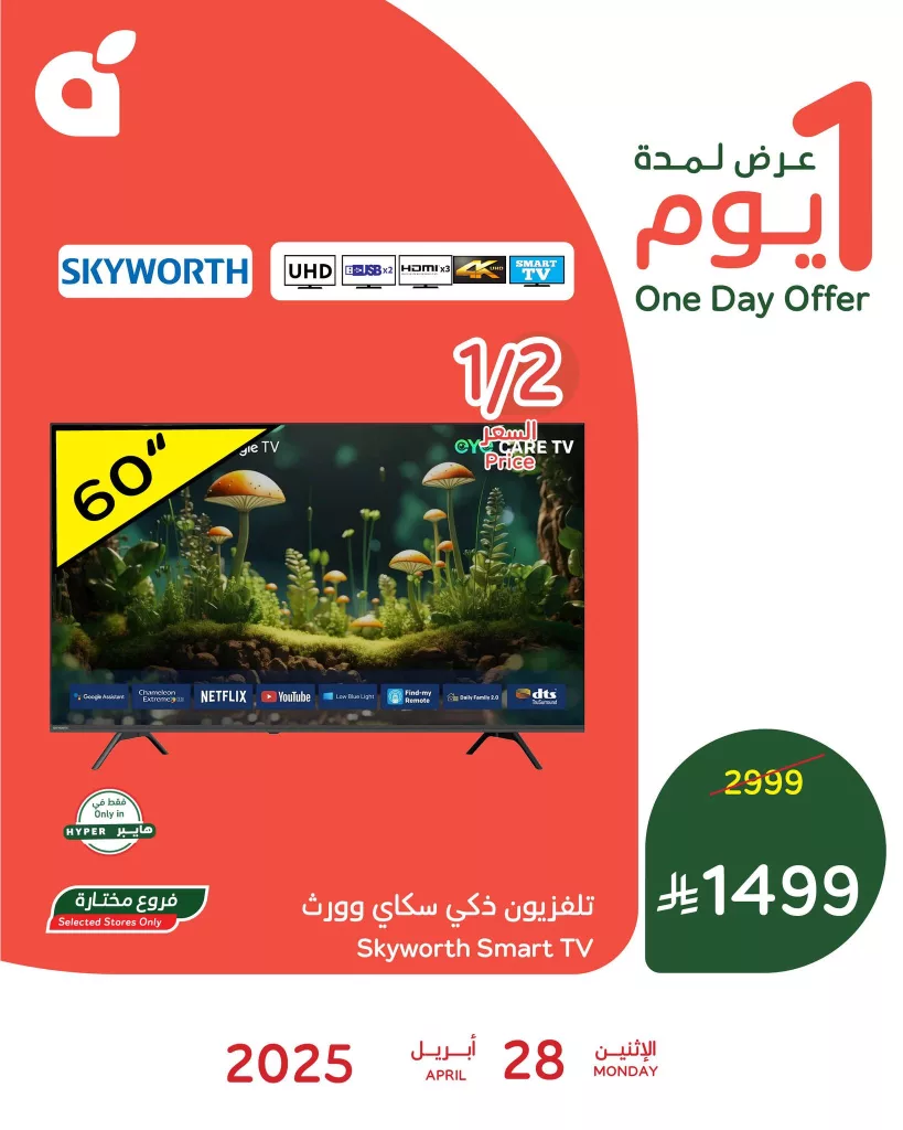 عروض بنده الاثنين 28 ابريل 2025 تقدم تجربة استثنائية لكل محبي التسوق الذكي حيث يمكنك الحصول على أفضل الأجهزة الإلكترونية بأقل الأسعار العرض الحالي يضم تلفزيون ذكي سكاي وورث بمواصفات مذهلة تشمل شاشة 4K UHD واتصال ذكي بعدة مداخل HDMI وUSB مما يوفر لك مشاهدة لا مثيل لها وجودة ترفيهية متكاملة