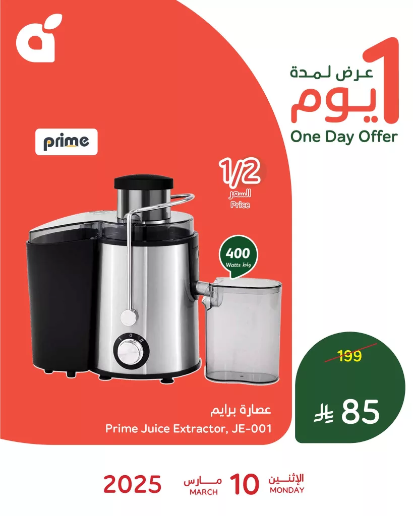 - عصارة برايم Prime Juice Extractor, JE-001 – 85 ريال سعودي (بدلاً من 199 ريال سعودي)