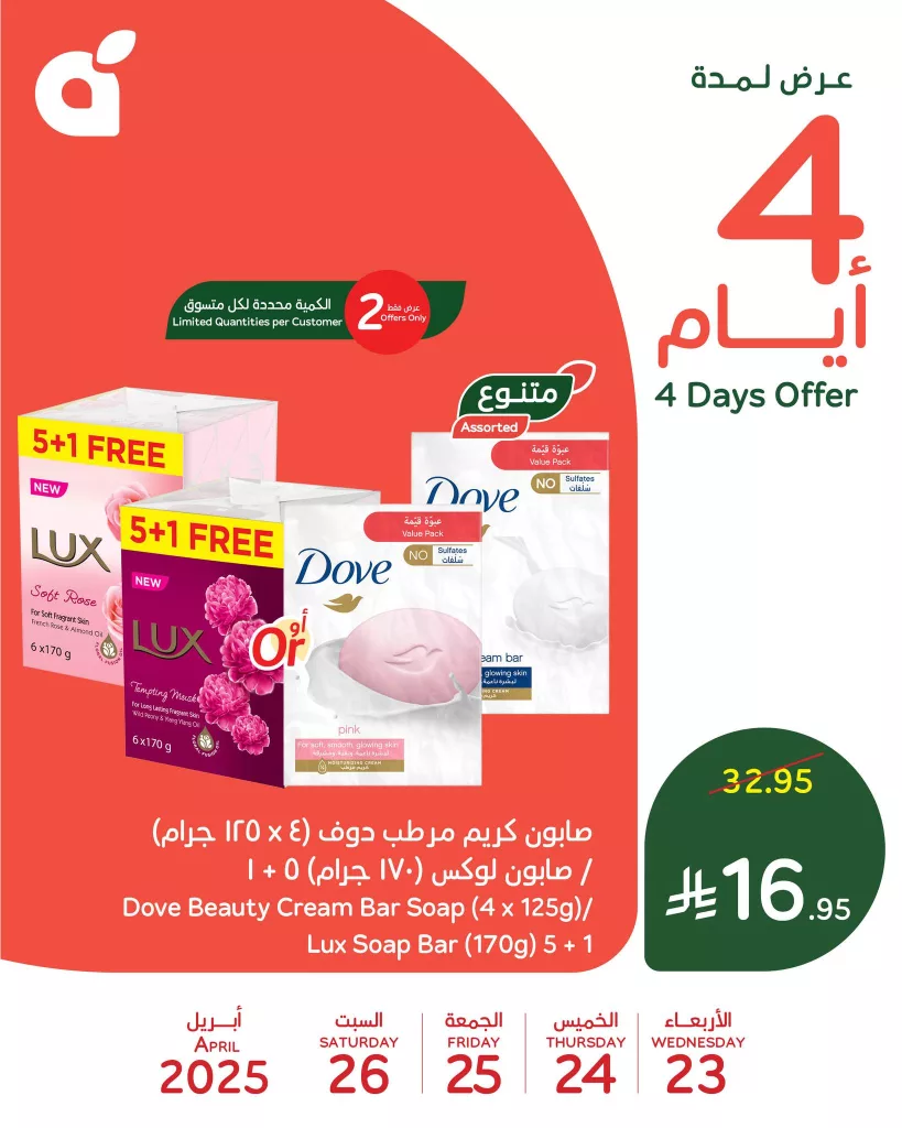 - صابون كريم مرطب دوف (4 × 125 جرام) + صابون لوكس (170 جرام) 5 + 1: 16.95 ريال بدلًا من 32.95 ريال