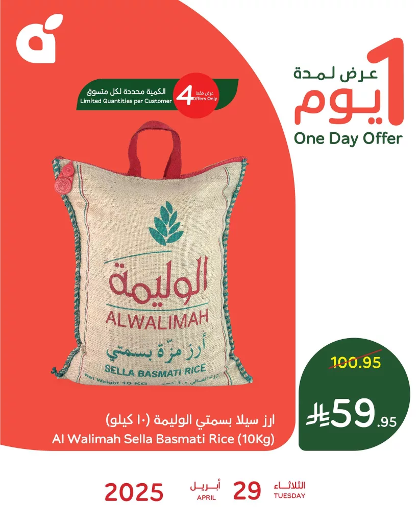 عروض بنده الثلاثاء 29 أبريل 2025 تقدم لك اليوم فرصة مميزة لتسوق ذكي وموفّر مع تخفيضات حصرية على منتجات مختارة بعناية تناسب كل بيت سعودي ومن أبرز ما تقدمه بنده في هذا اليوم المميز أرز الوليمة الفاخر المعروف بجودته العالية والذي يأتيك بعبوته الكبيرة التي تكفي احتياجات العائلة اليومية