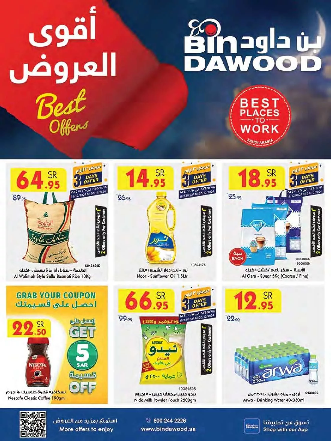 عروض بن داود جدة الخميس 19 ديسمبر 2024 تقدم تخفيضات هائلة على مجموعة متنوعة من المنتجات الغذائية الطازجة. تشمل العروض اللحوم الطازجة مثل لحم الغنم المفروم والدواجن المحلية، بجانب الأسماك الطازجة كالروبيان والسلمون. كما تشمل العروض الفواكه الطازجة و السلع الأساسية مثل الأرز البسمتي والزيوت النباتية