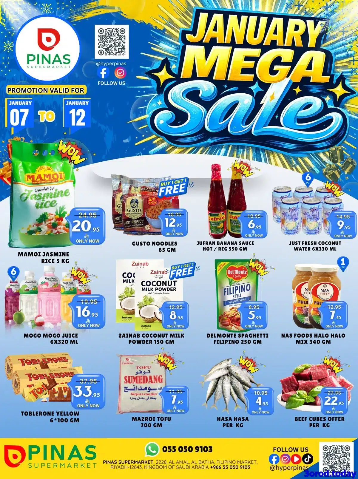 عروض بيناس الرياض الأربعاء 18 رجب 1447هـ الموافق 7 يناير 2026 و تبدأ بالأجهزة مثل قدر طهي وصينية فرن وميزان مطبخ وسخان أطعمة كهربائي ومروحة تهوية ثم تضم المنتجات الغذائية و بتشمل السبانخ والبطاطا والبصل والفلفل والكمثرى والزبيب وزيت الزيتون ودبس العنب باسعار مناسبة للجميع ابقوا معنا ليصلكم كل جديد