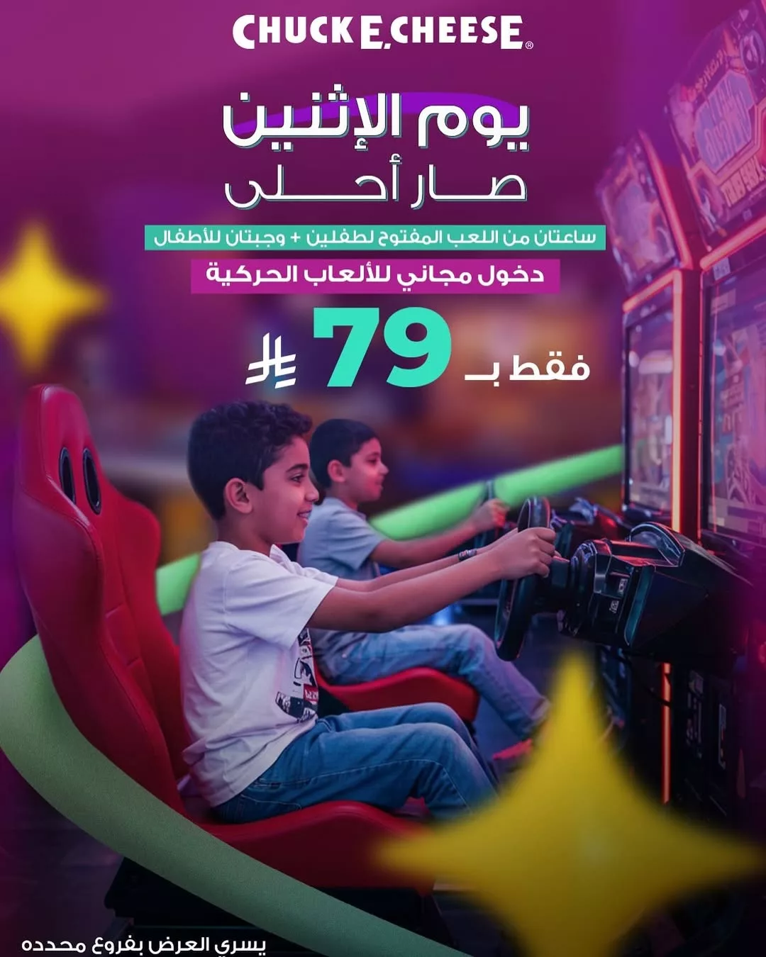 تقدم لكم تشكي تشيز السعودية عرض مميز للمرح فقط في يوم الاثنين 13 اكتوبر 2025 العاب و فعاليات بأسعار منافسة
