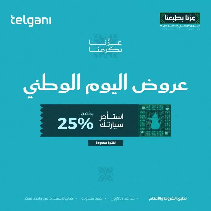 عروض تلقاني لتأجير السيارات خصم 25% بمناسبة اليوم الوطني