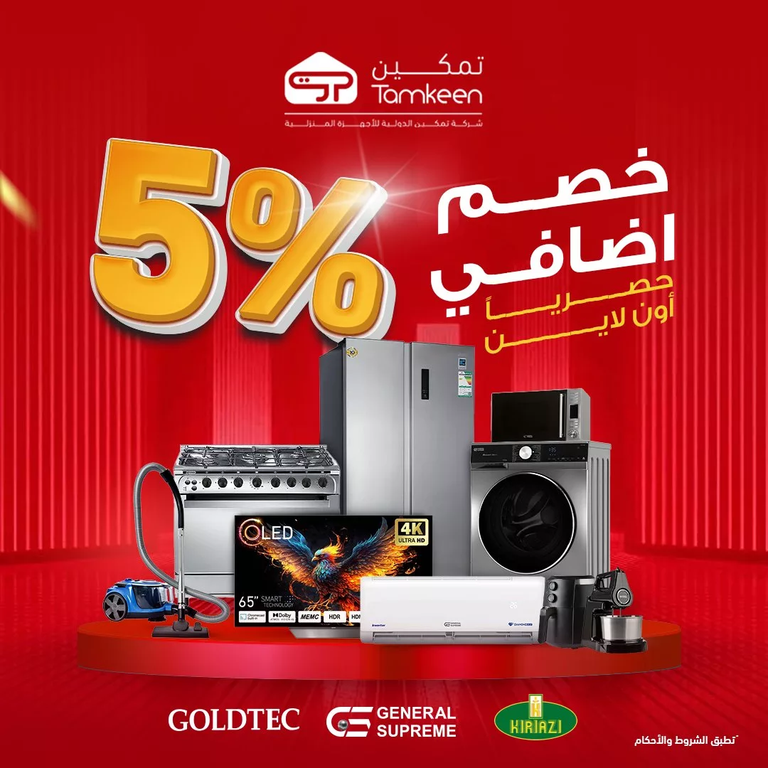 يمكنك الاستفادة من خصم إضافي 5% عند التسوق عبر موقع أو تطبيق تمكين الإلكتروني، على منتجات مختارة من جنرال سوبريم، جولدتك، وكريازي، فقط عبر الرابط: tamkeenstores.com.sa/ar