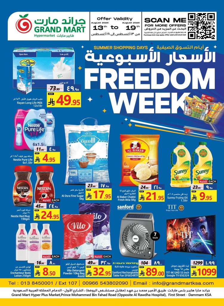 عروض جراند مارت الدمام الأسبوعية الأربعاء 19 صفر 1447هـ تقدم منتجات غذائية تشمل الأسماك البحرية الطازجة والمأكولات البحرية المجمدة والفواكه الاستوائية مثل المانجو والبابايا والحليب بالنكهات وحبوب الإفطار بالشوكولاتة بالإضافة إلى الأجهزة المنزلية التي تضم الغلايات الكهربائية وصانعات القهوة الكبسولية