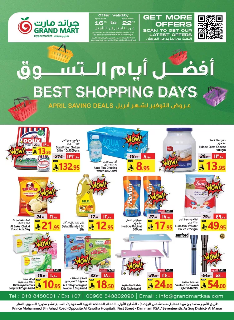 عروض جراند مارت الدمام الأربعاء 16 أبريل 2025 تقدم عروضًا قوية على المنتجات الغذائية مثل التمور والعسل والمربى والسكر والزيت والأرز والمعلبات المختلفة من تونة وفول وعدس وفاصوليا وصلصة طماطم بالإضافة إلى العصائر والمشروبات الباردة واللبن والحليب المجفف والخبز والمعجنات