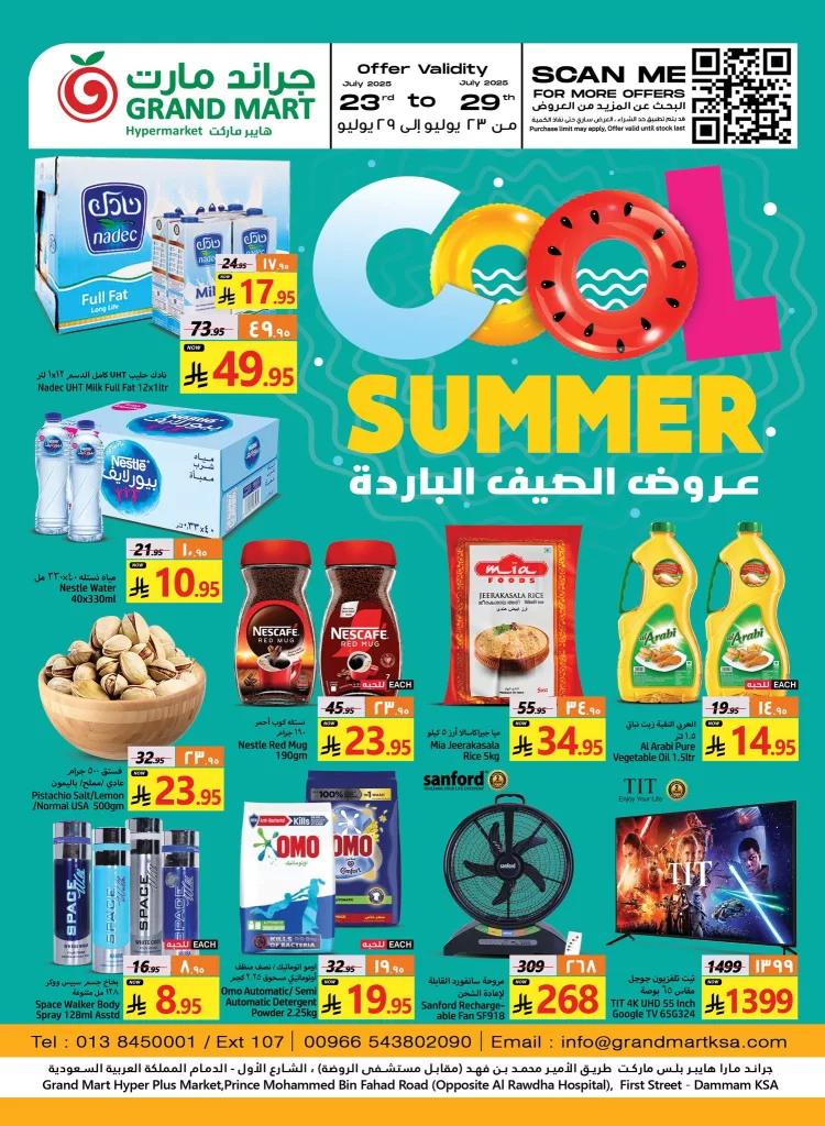 عروض جراند مارت الدمام الأسبوعية الأربعاء 23/7/2025 تشمل مجموعة راقية من الأجهزة المنزلية مثل مكائن الإسبريسو الصغيرة و محضّرات الطعام بملحقات للعجن والطحن و المراوح متعددة الاتجاهات وأنظمة التبريد الخفيفة وأفران المايكروويف المعدلة للاستخدام العائلي