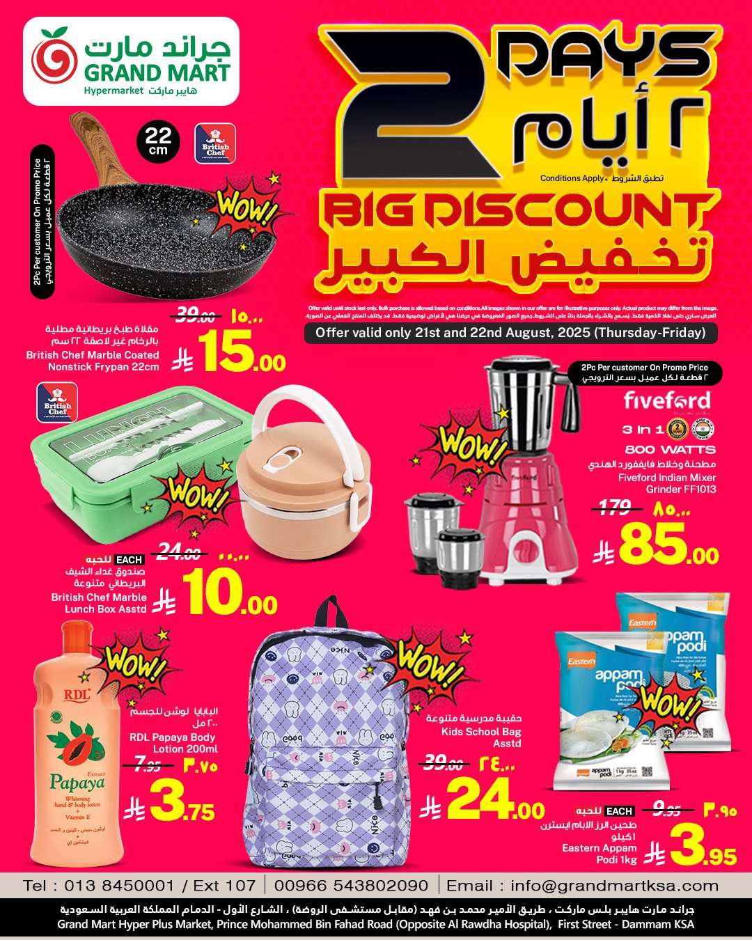 عروض جراند مارت الدمام الخميس 21 اغسطس 2025 تقدم تشكيلة مميزة من المنتجات الغذائية الأساسية حيث تشمل العروض حليب طويل الأجل وجبن كريمي وأرز بأنواعه المتنوعة بالإضافة إلى الدجاج المجمد والناغتس و تمتد لتشمل الأجهزة المنزلية والأدوات العملية مثل المقالي غير اللاصقة والخلاطات متعددة الاستخدامات