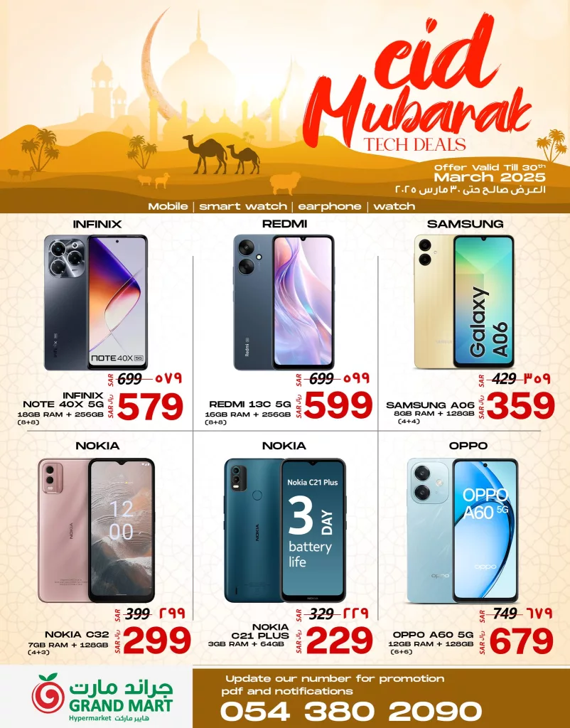 عروض جراند مارت الدمام السبت 29 مارس 2025 تأتي بتشكيلة متنوعة من الهواتف الذكية الحديثة التي تلبي مختلف الاحتياجات حيث تشمل المجموعة أجهزة من علامات تجارية مرموقة مثل إنفينيكس و ريدمي و سامسونج و أوبو ونوكيا وتتميز هذه الأجهزة بمواصفات قوية تشمل سعة تخزين كبيرة، ذاكرة وصول عشوائي متعددة