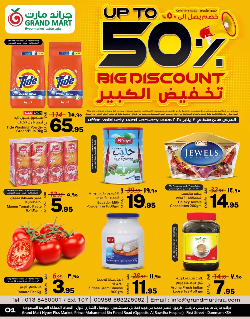 عروض جراند مارت الدمام الجمعة 3 يناير 2025 تتميز بتخفيضات تصل إلى 50% على مجموعة كبيرة من المنتجات مما يجعلها فرصة مميزة للتوفير و تشمل العروض منتجات أساسية للأطعمة مثل الحليب المجفف و معجون الطماطم ومسحوق الغسيل من العلامات التجارية الشهيرة بالإضافة إلى تخفيضات على منتجات العناية الشخصية
