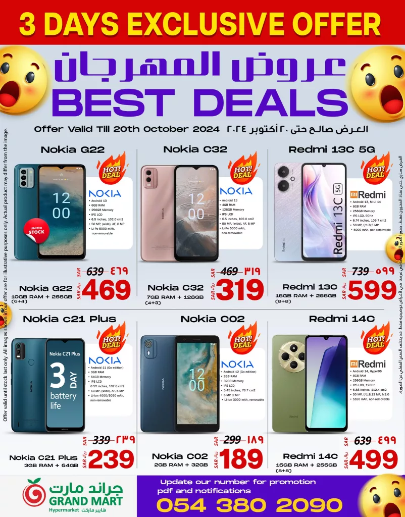 عروض جراند مارت الدمام الخميس 17 أكتوبر 2024 توفر لعملائها مجموعة واسعة من الهواتف الذكية بأسعار تنافسية ومغرية و تتميز العروض بتنوع الأجهزة من العلامات التجارية الشهيرة مثل Nokia وXiaomi مع خصومات هائلة على مجموعة مختارة من الهواتف بأسعار تناسب ميزانيتك.