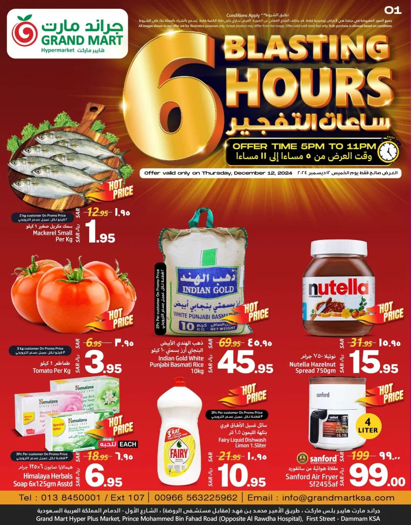 عروض جراند مارت الدمام الخميس 12 ديسمبر 2024 توفر للعملاء فرصة الحصول على منتجات عالية الجودة بأسعار مخفضة و تشمل العروض السلع التموينية مع تخفيضات على اللحوم المجمدة والدواجن كما تشمل العروض الفواكه والخضروات الطازجة التي تقدم بجودة ممتازة.