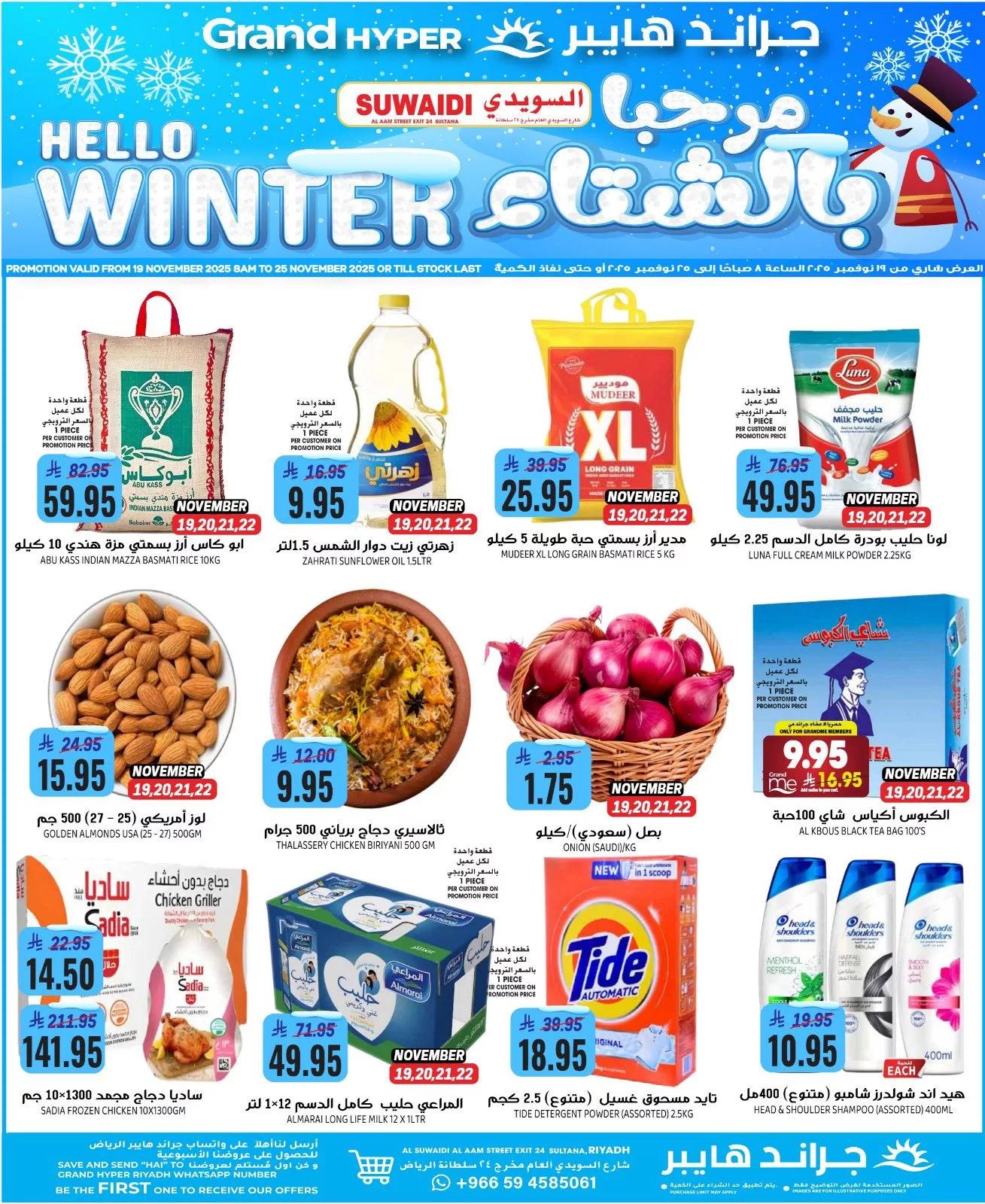 عروض جراند هايبر الرياض الأربعاء 28 جمادى الأولى 1447هـ تبدأ بالأجهزة المنزلية منها أفران ميني للطهي ومحضرات طعام عالية القدرة وغلايات ستانلس وشوايات ومقالي هوائية ثم تقدم المنتجات الغذائية و تضم البطاطس والفلفل الأحمر والطماطم والبصل والعنب والتفاح إضافة إلى الدجاج وغيرها من المنتجات وباسعار تنافسية .