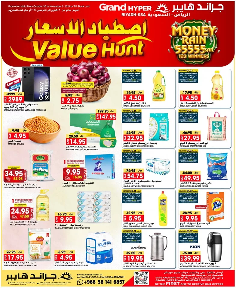 عروض جراند هايبر الرياض يوم الأربعاء 30 أكتوبر 2024 تشمل خصومات مميزة على المنتجات الطازجة مثل الخضروات والفواكه إضافة إلى اللحوم الطازجة والدواجن من مصادر موثوقة ما يضمن للعملاء الجودة العالية بأسعار تنافسية كما تتضمن العروض تخفيضات على السلع الأساسية مثل الأرز والزيوت ومنتجات الألبان