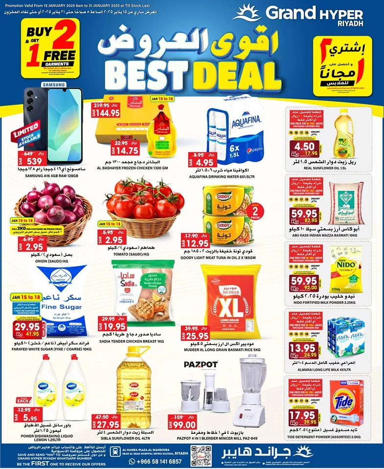عروض جراند هايبر الرياض الأربعاء 15 يناير 2025 تمنحك فرصة تسوق استثنائية مع تخفيضات شاملة على مختلف الأقسام و تبدأ العروض بخصومات على الفواكه الطازجة مثل البرتقال و الكيوي والتفاح بالإضافة إلى الخضروات الموسمية التي تناسب جميع الأذواق كما تتوفر عروض خاصة على منتجات الإفطار