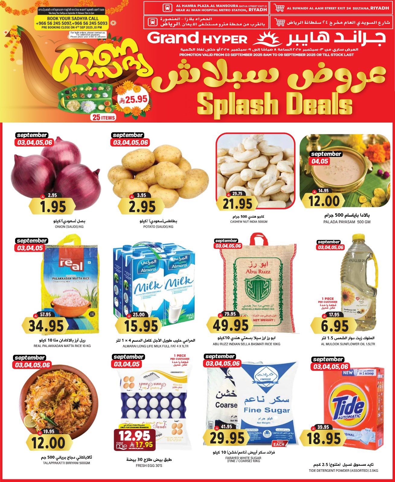 عروض جراند هايبر الرياض الأسبوعية الخميس 12 ربيع الأول 1447هـ تقدم منتجات غذائية أساسية تشمل العدس البني و الفاصوليا البيضاء و البرغل و الشعير و الأرز المصري و الحمص المعلب بالإضافة إلى الأجهزة المنزلية التي تضم أجهزة طحن البن و أفران الطهي بالبخار و أجهزة تحضير الشاي المبرمج و أجهزة تحضير العصائر الطازجة