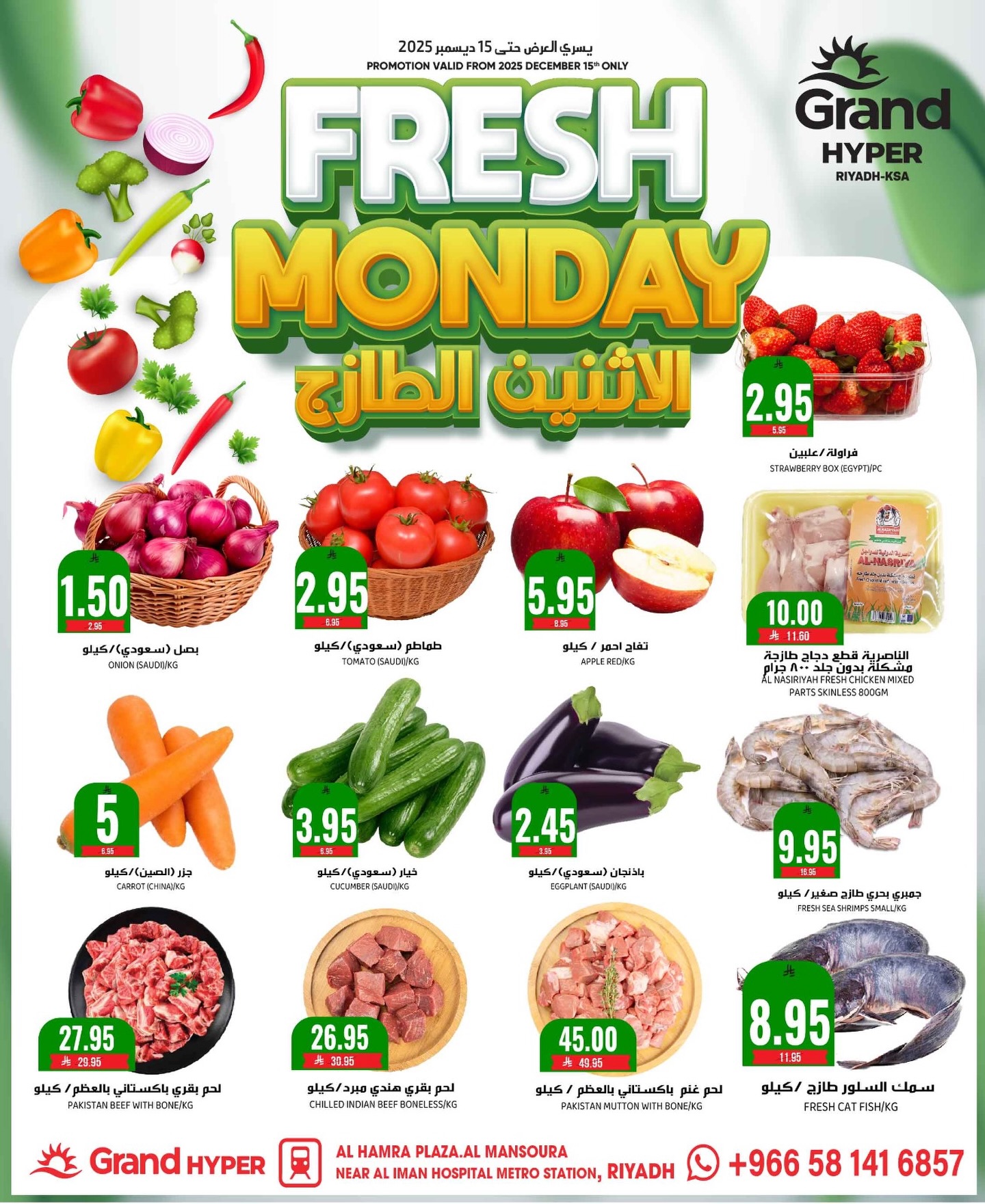 نستعرض معاكم احدث عروض جراند هايبر الرياض بتاريخ الاثنين 15 ديسمبر 2025 و تحتوي علي تشكيلة من افضل الخضروات و الفواكه الطازجة و كذلك ايضا تضم الاسماك الشهية و غيرها من المنتجات في عرض حصري متاح اليوم فقط و باقل الاسعار و بنوفر كمان تغطية مباشرة لـ عروض بنده اليوم فقط تابعونا علي موقعكم عروض توداي ليصل اليكم كل جديد