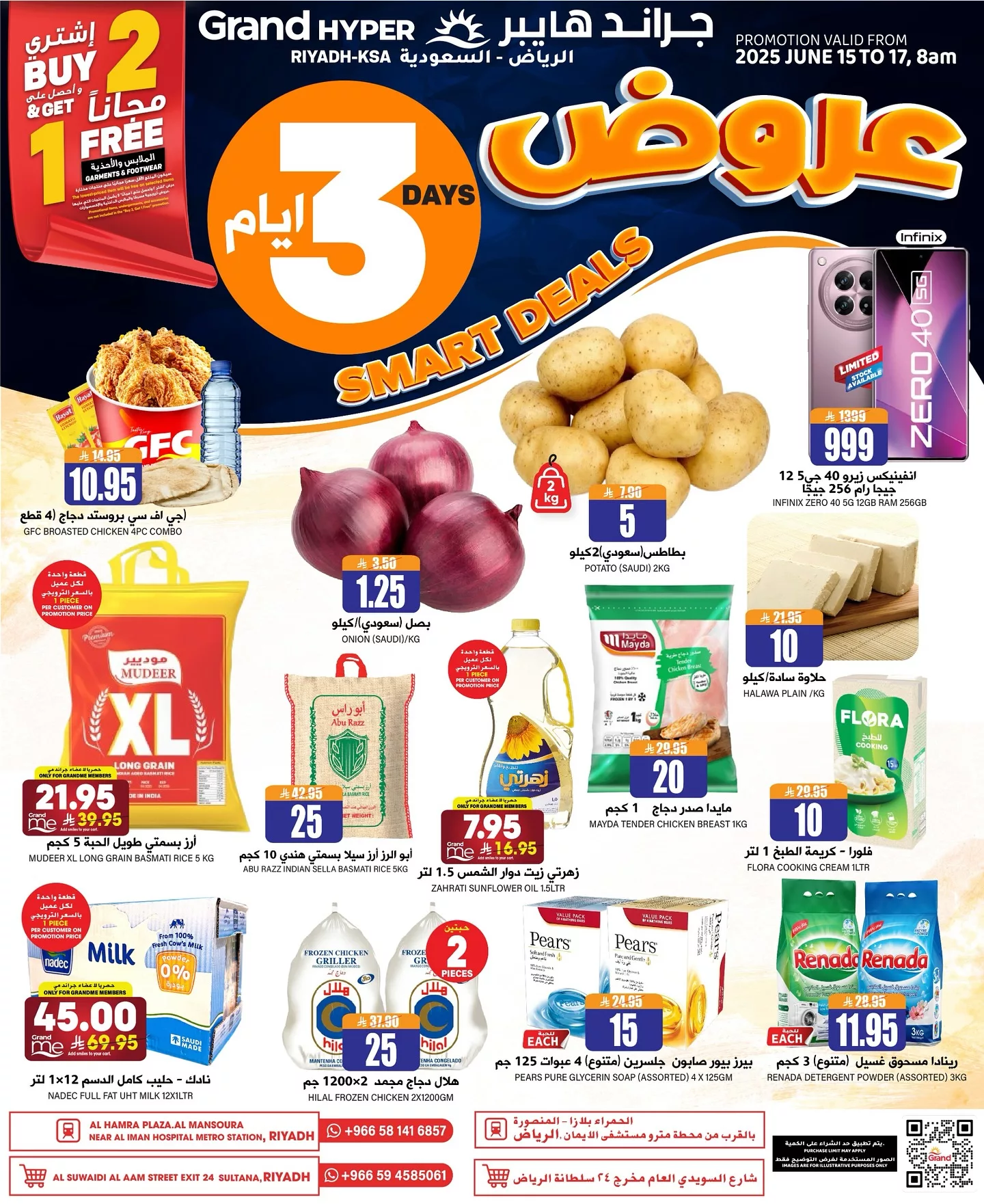 عروض جراند هايبر الرياض تقدم لك تشكيلة واسعة من المنتجات الغذائية والاستهلاكية اليومية بأسعار تنافسية تشمل خضروات طازجة مثل البطاطس والبصل بالإضافة إلى أرز بسمتي بأنواعه وزيوت الطهي المختلفة مثل زيت زهرة وفلورا ومجموعة مميزة من اللحوم المجمدة والدواجن والعصائر والمياه المعدنية
