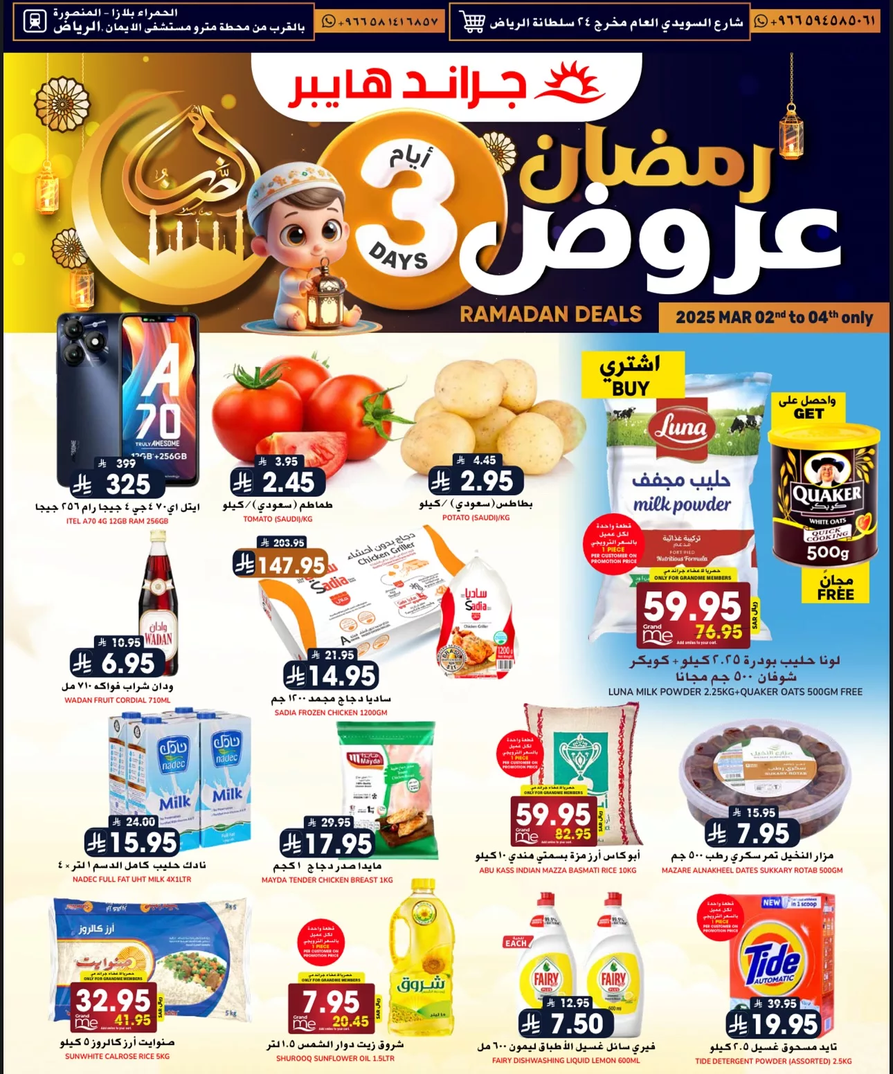 تقدم عروض جراند هايبر الرياض الاحد 2 مارس 2025 تخفيضات حصرية بمناسبة رمضان حيث تشمل التخفيضات العديد من المنتجات الأساسية مثل اللحوم الطازجة والدواجن والمأكولات البحرية بالإضافة إلى مجموعة واسعة من الفواكه والخضروات الطازجة و يمكنكم الاستفادة من الأسعار المخفضة على منتجات مختارة