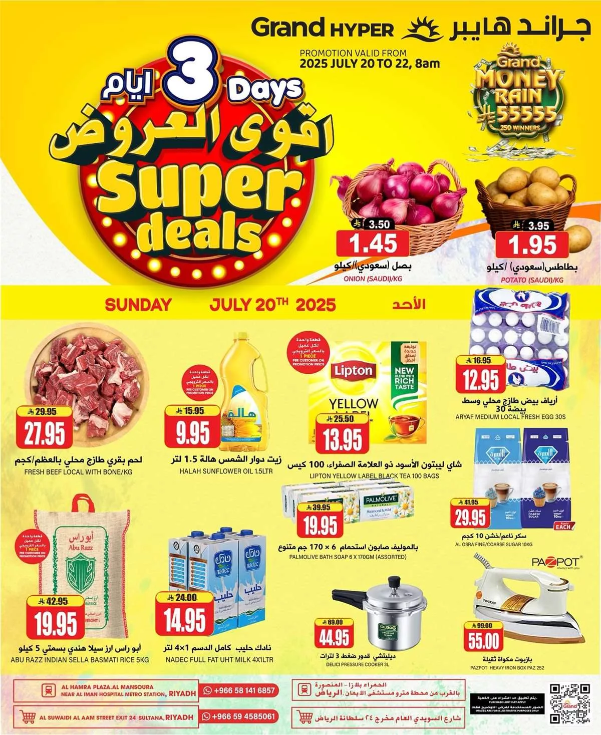 عروض جراند هايبر الرياض تشمل العروض أيضا مجموعة مميزة من المنتجات الأساسية مثل اللحوم الطازجة والأرز والزيت والحليب طويل الأجل مع توفر منتجات العناية الشخصية والمنزلية مثل مسحوق الصابون والمكواة والقدر الضغط بأسعار تنافسية