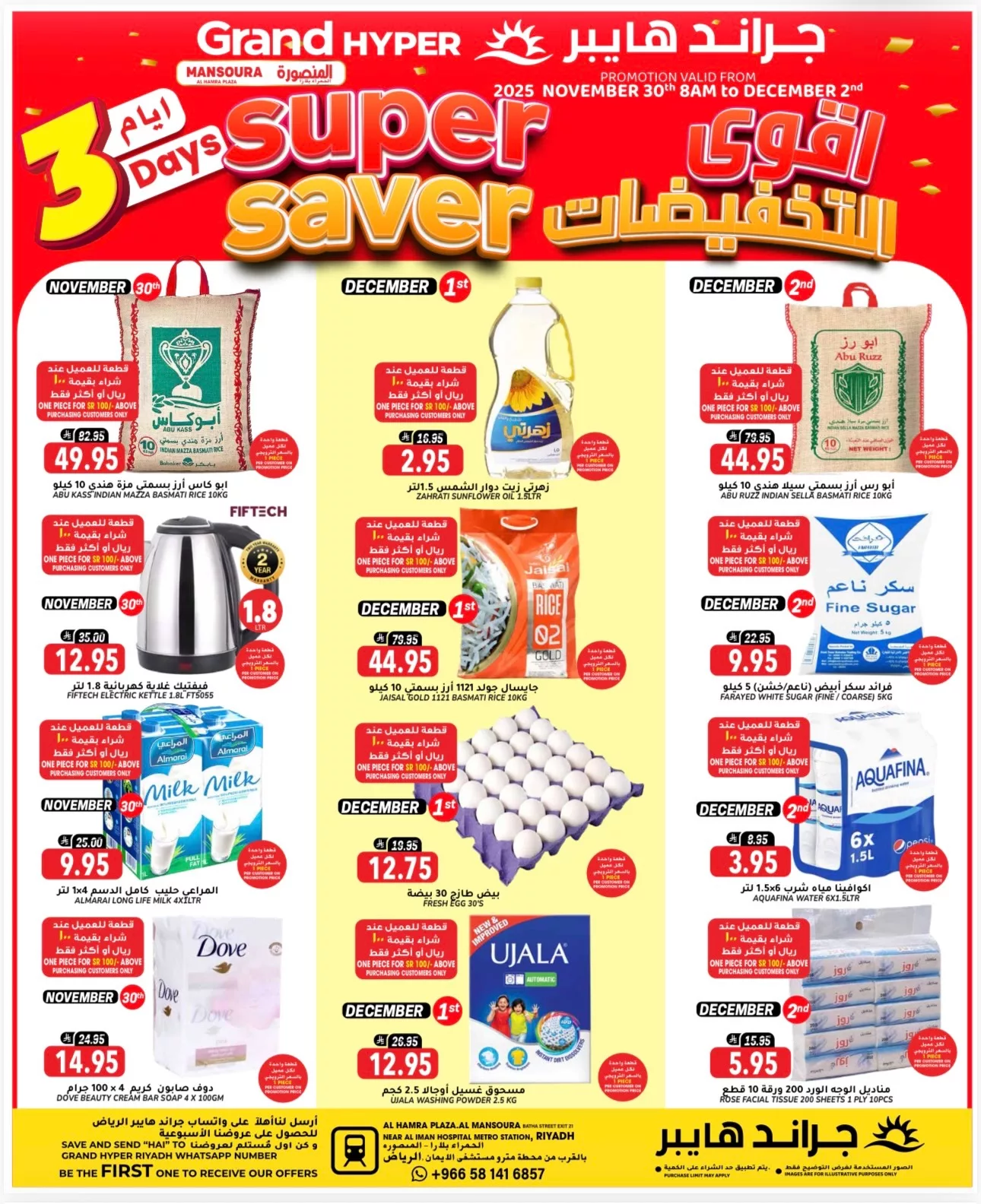 نستعرض لكم احدث عروض جراند هايبر الرياض الاحد 30 نوفمبر 2025 و بتحتوي علي الأرز والزيوت والمنظفات والبيض والمياه المعبأة إضافة إلى منتجات العناية الشخصية بجانب الي الخضروات المجمدة والبطاطس المقلية وشرائح الدجاج والمنتجات الجاهزة وغيرها من المنتجات و بارخص الاسعار في عروض حصرية لفترة محدودة