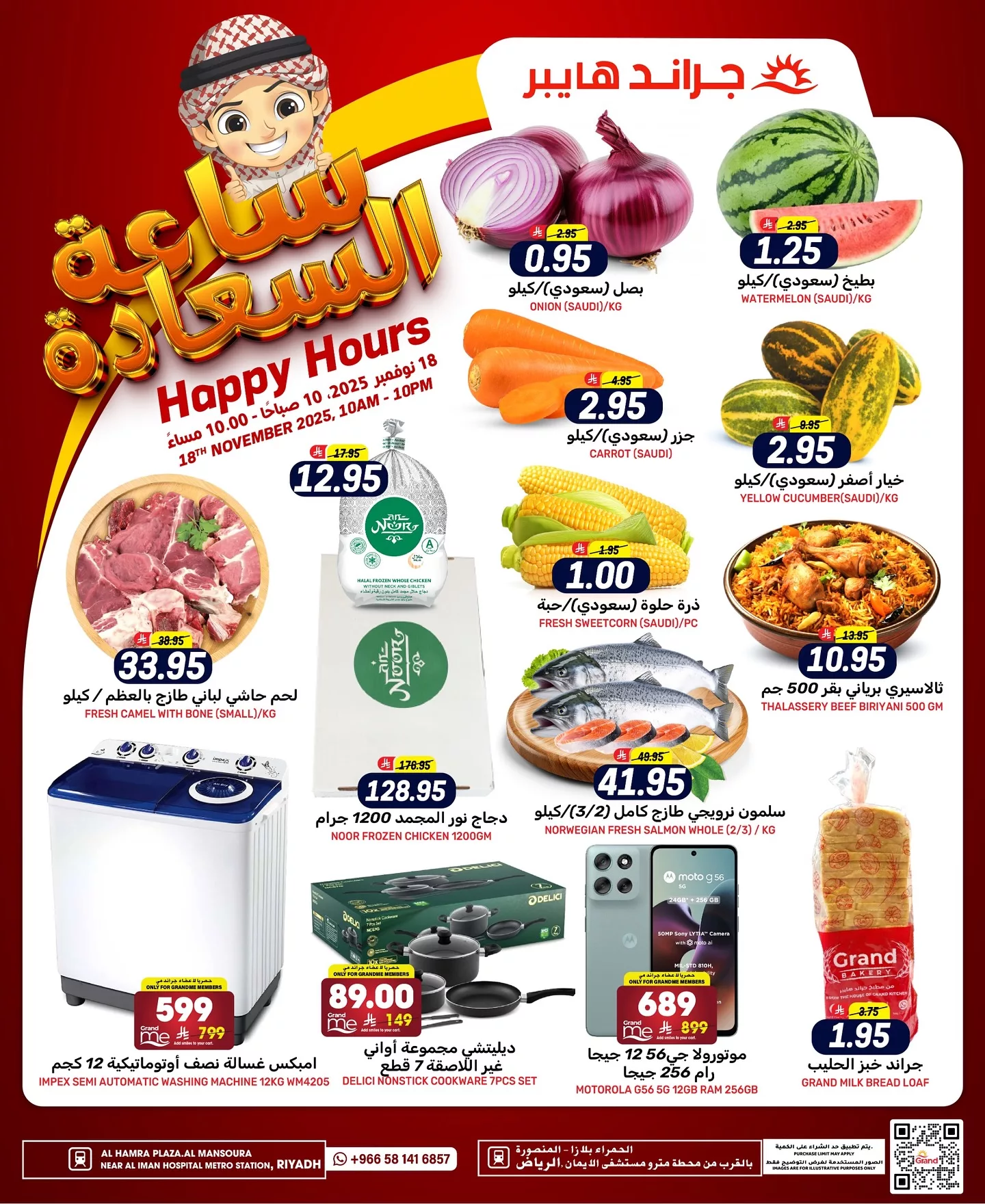 عروض جراند هايبر الرياض الطازج الثلاثاء 18 نوفمبر 2025 تقدم لكم افضل المنتجات الغذائية التي تضم اشهي الفواكه و الخضروات الطازجة منها بطيخ سعودي و بصل و خيار اصفر و ذرة حلوة بالاضافة الي جراند خبز الحليب و سملون نرويجي طازج كامل و غيرها من المنتجات و باقل الاسعار تابعونا ليصلكم كل جديد علي موقعكم عروض توداي