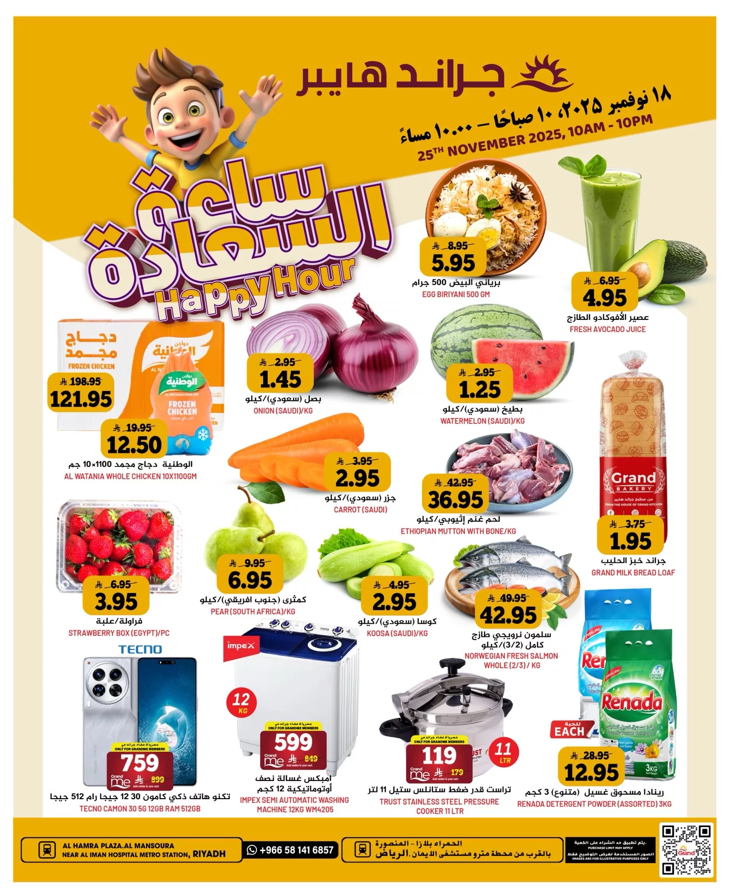 نستعرض معاكم احدث عروض جراند هايبر الرياض الثلاثاء 4 جماد الاخر 1447هـ و تشمل علي الفاكهة والخضار مثل الفراولة والبطيخ والكوسا والجزر والبصل إضافة إلى اللحوم الطازجة مثل لحم الضأن الإثيوبي والسلمون النرويجي الطازج ويشمل أيضا منتجات متعددة مثل الخبز الطازج العصائر الطبيعية ومسحوق الغسيل