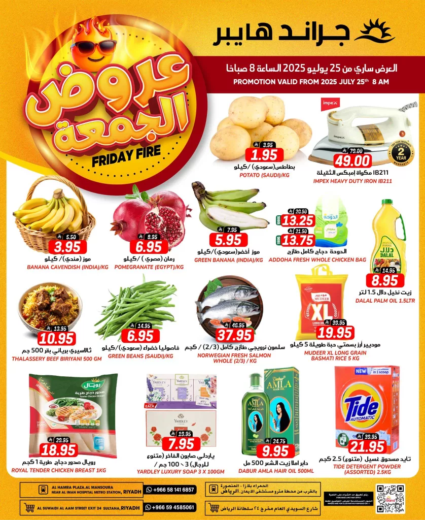 عروض جراند هايبر الرياض الطازج ليوم الجمعة 25/7/2025 و تشمل عروض اليوم علي الفواكه الطازجة و الاسماك الشهية و الخضروات و تضم ايضا تخفيضات جراند هايبر الرياض علي السلع الاساسية من تايد مسحوق غسيل و زيت نخيل و غيرها من المنتجات الضرورية في اي منزل و باسعار تنافسية ابقوا معنا علي موقعكم عروض توداي .