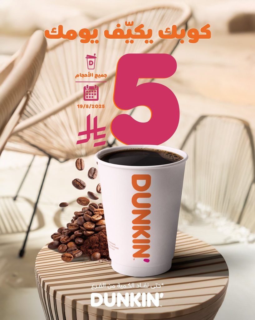 عرض خاص من دانكن دونتس بتاريخ 19 أغسطس 2025 حيث يمكنكم الاستمتاع بكوب قهوة ساخن أو بارد من جميع الأحجام بسعر استثنائي فقط 5 ريال العرض متاح في جميع فروع دانكن داخل المملكة وبكافة الأحجام لتختار ما يناسبك استمتعوا بطعم القهوه