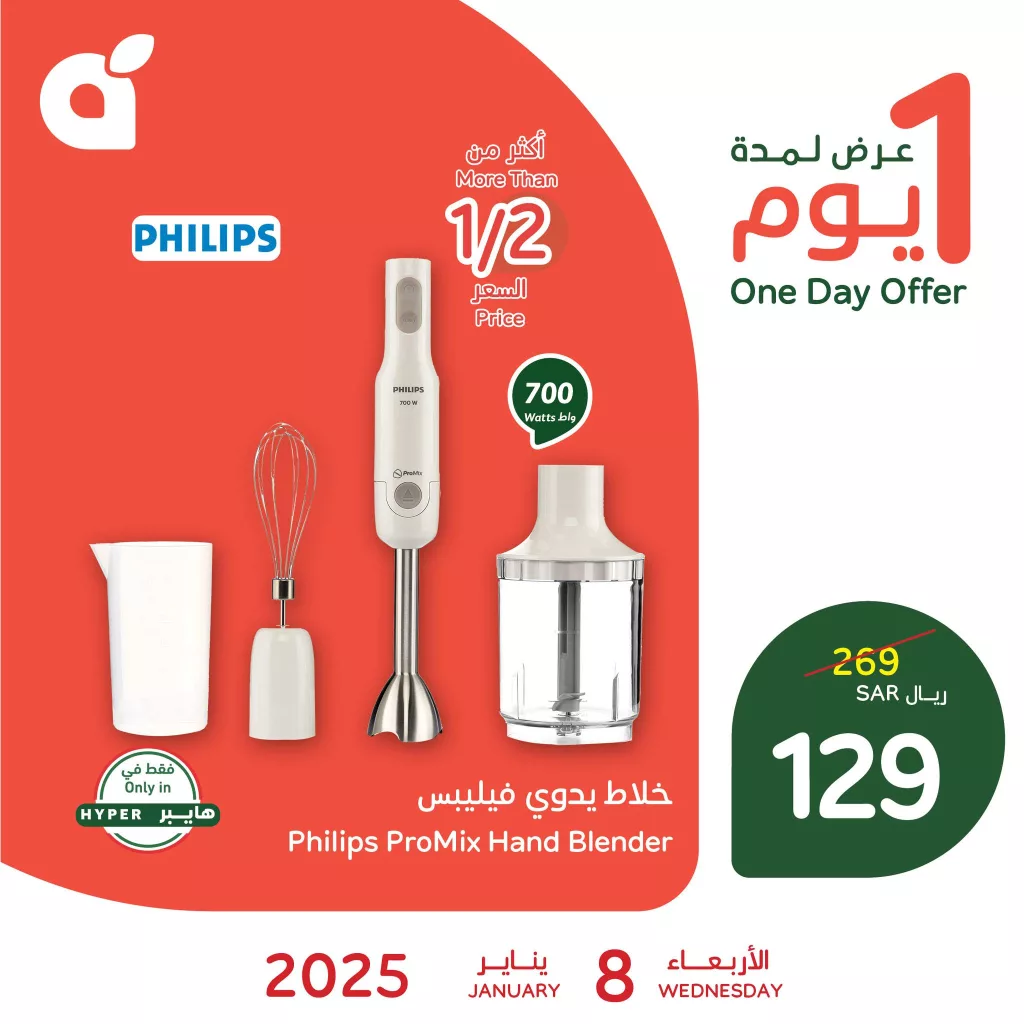 عرض هايبر بنده المميز ليوم واحد فقط الأربعاء 8 يناير 2025 هو فرصة ذهبية لعشاق التسوق للاستفادة من خصومات مذهلة على مجموعة واسعة من المنتجات و يتميز العرض بخصم أكثر من نصف السعر على الخلاط اليدوي من فيليبس الذي يجمع بين الأداء العالي والتصميم العملي.