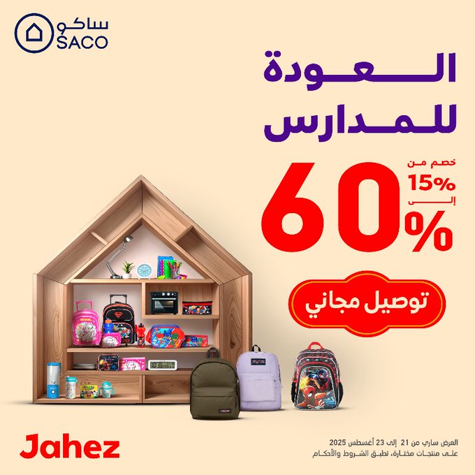 عروض ساكو العودة للمدارس عبر متاجر جاهز لتوفر خصومات كبيرة تصل حتى 60%، وذلك خلال الفترة من 21 أغسطس وحتى 23 أغسطس 2025، مما يجعلها فرصة مثالية للاستعداد للعام الدراسي الجديد بأقل الأسعار