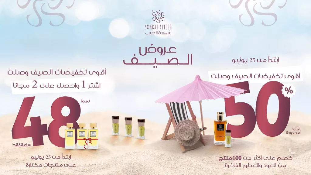 في موسم الصيف المتألق بعروضه الجذابة في المملكة العربية السعودية، تبرز عروض سكة الطيب كواحدة من أبرز الوجهات لعشاق العطور والعود الفاخر، حيث تبدأ التخفيضات المميزة من 25 يونيو وتشمل خصومات تصل إلى 50% على مجموعة واسعة من المنتجات المختارة. هذا النوع من العروض هو ما يجعل تجربة التسوق أكثر إغراءً، خصوصاً لعشاق التميز والرقي في عالم العطور