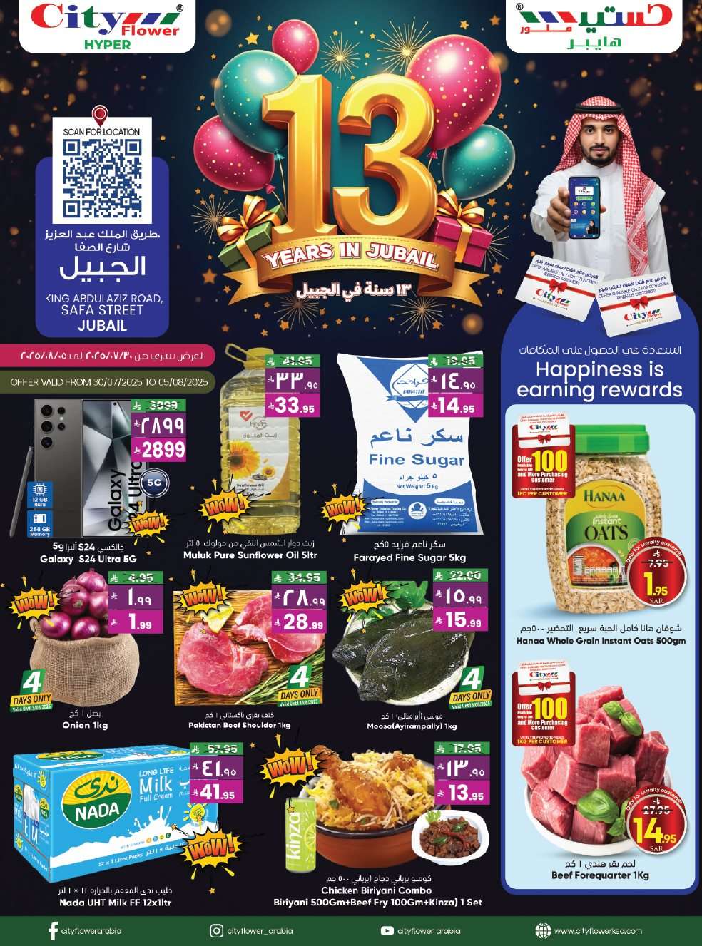 عروض سيتي فلور الجبيل الأسبوعية الأربعاء 30/7/2025 تضمنت منتجات غذائية مثل المربى الحرفي بنكهات الفواكه الموسمية والفواكه المجففة الفاخرة والمعلبات المختارةإلى جانب حبوب الإفطار والعصائر الطبيعية والحليب وتشمل أيضًا أجهزة منزلية مثل المكاوي البخارية المحمولة والمراوح المكتبية والخلاطات صغيرة الحجم وصانعات القهوة