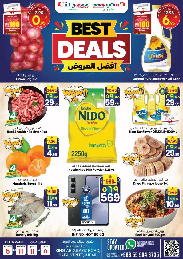 عروض سيتي فلور الجبيل الأسبوعية الأربعاء 14-5-1447هـ تحتوي على عروض على الأغذية الطازجة من الفواكه والخضروات والعسل الطبيعي والمكسرات والبهارات الشرقية والمخبوزات والفواكه المجففة ومنتجات الإفطار كما تقدم تخفيضات على الأجهزة المنزلية مثل أفران الطبخ وأجهزة العجن وأفران التحميص و ادوات المطبخ الاساسية