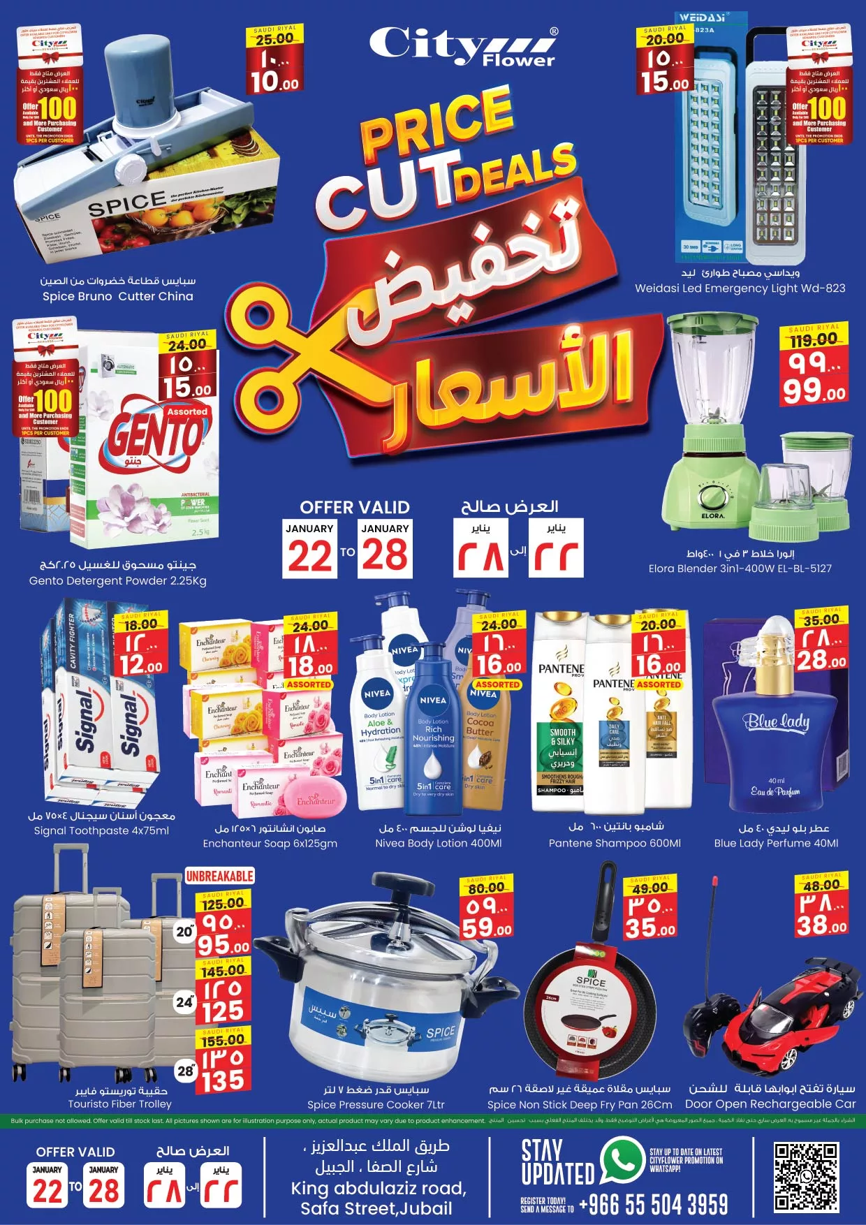 تتميز عروض سيتي فلور الجبيل بتنوعها الكبير حيث تضم تخفيضات على المنتجات الأساسية مثل الحبوب و الزيوت والشوكولاتة إلى جانب الأجهزة المنزلية وأدوات المطبخ كما توفر السوق عروضا خاصة على اللحوم الطازجة والأسماك بمختلف أنواعها مما يضمن للعملاء شراء المنتجات بجودة عالية وبأفضل الأسعار