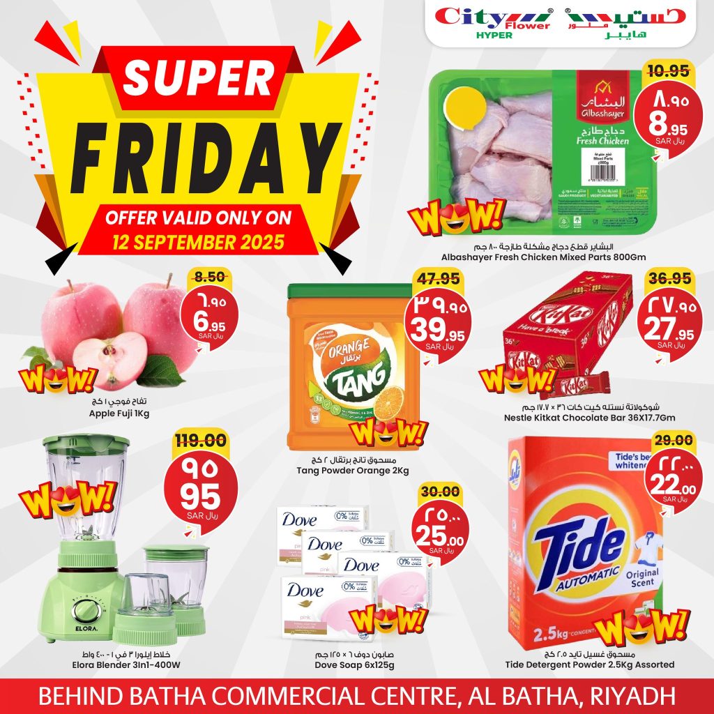 عروض سيتي فلور الرياض الجمعة 12 سبتمبر 2025 تأتي لتمنح المتسوقين تشكيلة من خضار وفواكه ولحوم ودواجن إلى جانب المشروبات والوجبات الخفيفة الشهية و تمتد لتشمل منتجات العناية الشخصية وأدوات المطبخ المبتكرة ومساحيق الغسيل الموثوقة باقل الاسعار المناسبة للجميع فقط تابعونا ليصل اليكم كل جديد .