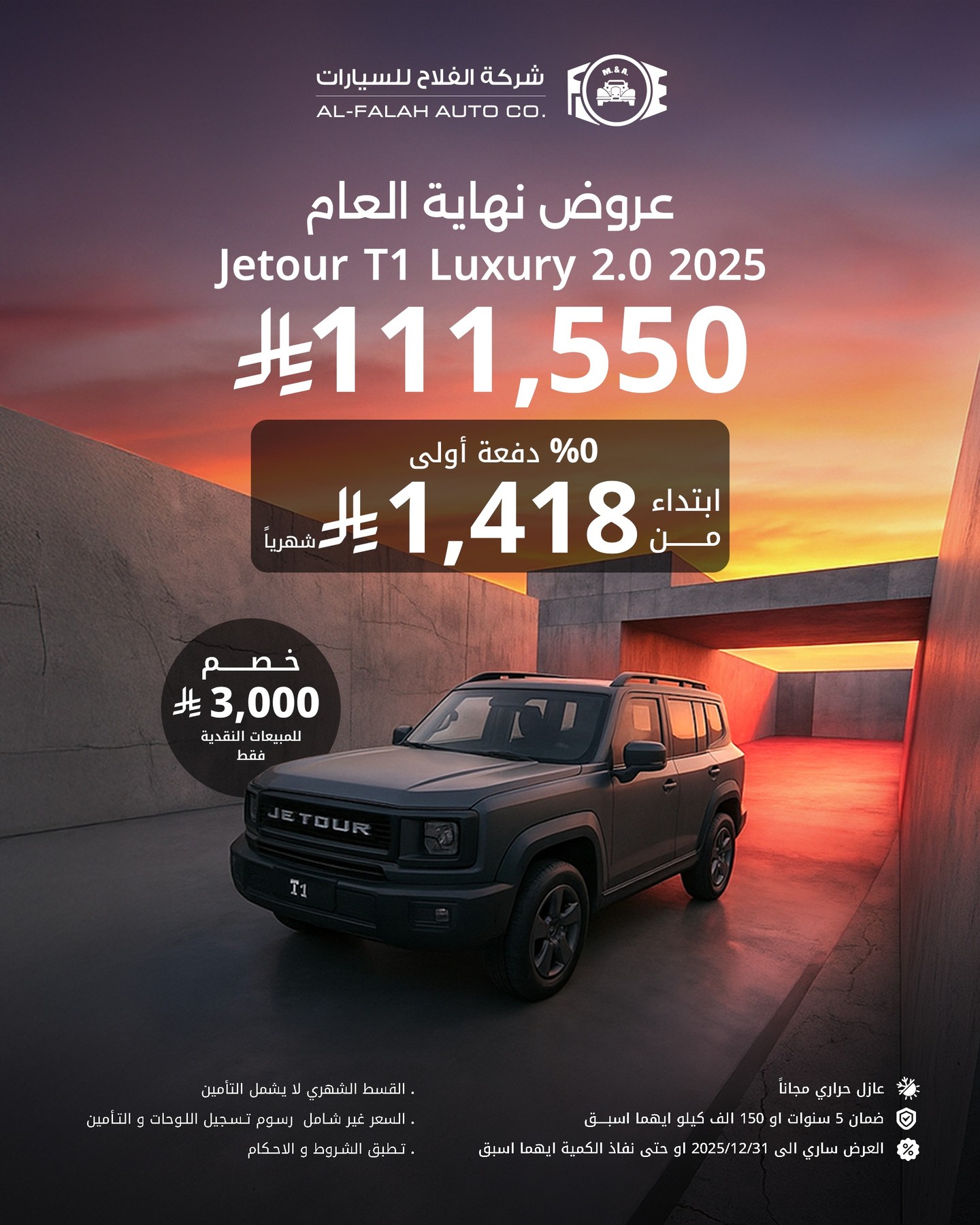 - Jetour T2 Comfort 2.0 2026 السعر للكاش 123.050 ريال / للتقسيط 1.546 ريال
