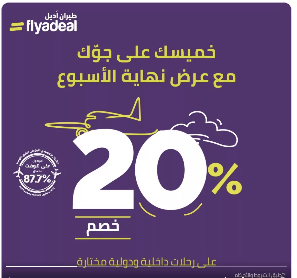 إذا كنت من محبي السفر وتبحث عن أفضل العروض لتخفيض تكاليف رحلاتك، فإن طيران أديل يقدم لك عرضًا استثنائيًا على الرحلات الداخلية والدولية المختارة! استفد الآن من خصم يصل إلى 20% على رحلاتك القادمة، وسافر بأفضل الأسعار مع طيران أديل.
