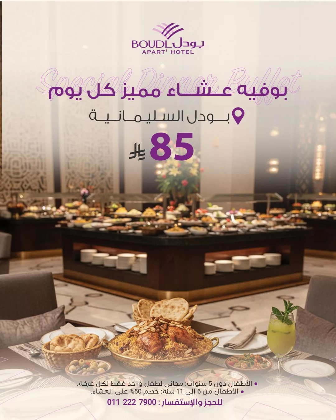 عروض فنادق بودل على بوفيه العشاء اليومي بسعر 85 ريال فقط العرض متوفر في بودل السليمانية بشكل يومي