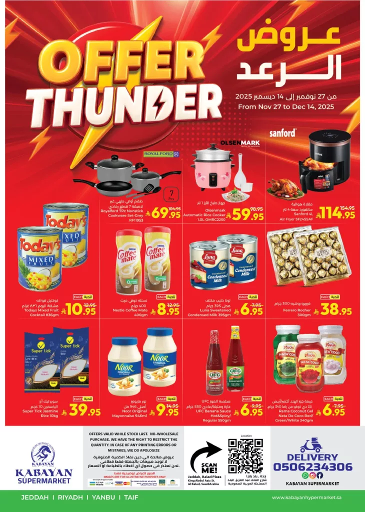 نستعرض معاكم اليوم احدث عروض كابيان هايبر ماركت جدة الخميس 27 نوفمبر 2025 منتجات الأرز وزيوت الطهي والمعكرونة والشعيرية إلى جانب الخضروات والفواكه بالاضافة لـ مشتقات جوز الهند والفطر واللحوم المعلبة والأسماك إضافة إلى أدوات المطبخ العصرية مثل طقم الطهي الكهربائي وأجهزة طهي الأرز باقل الاسعار