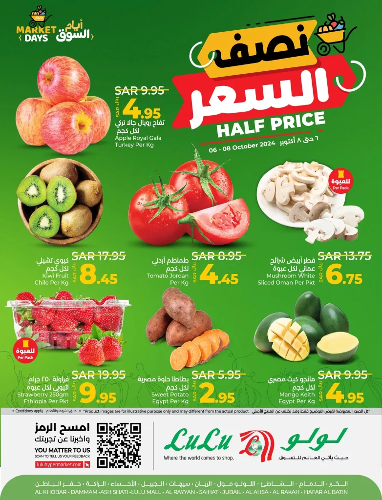 عروض لولو الأحساء تشمل تشكيلة رائعة من الخضروات والفواكه الطازجة من التفاح التركي إلى الفراولة الإثيوبية والطماطم الأردنية و ستحظى بتجربة تسوق استثنائية مع منتجات طازجة وأسعار نصفية تجعل هذه العروض فرصة لا تفوت.